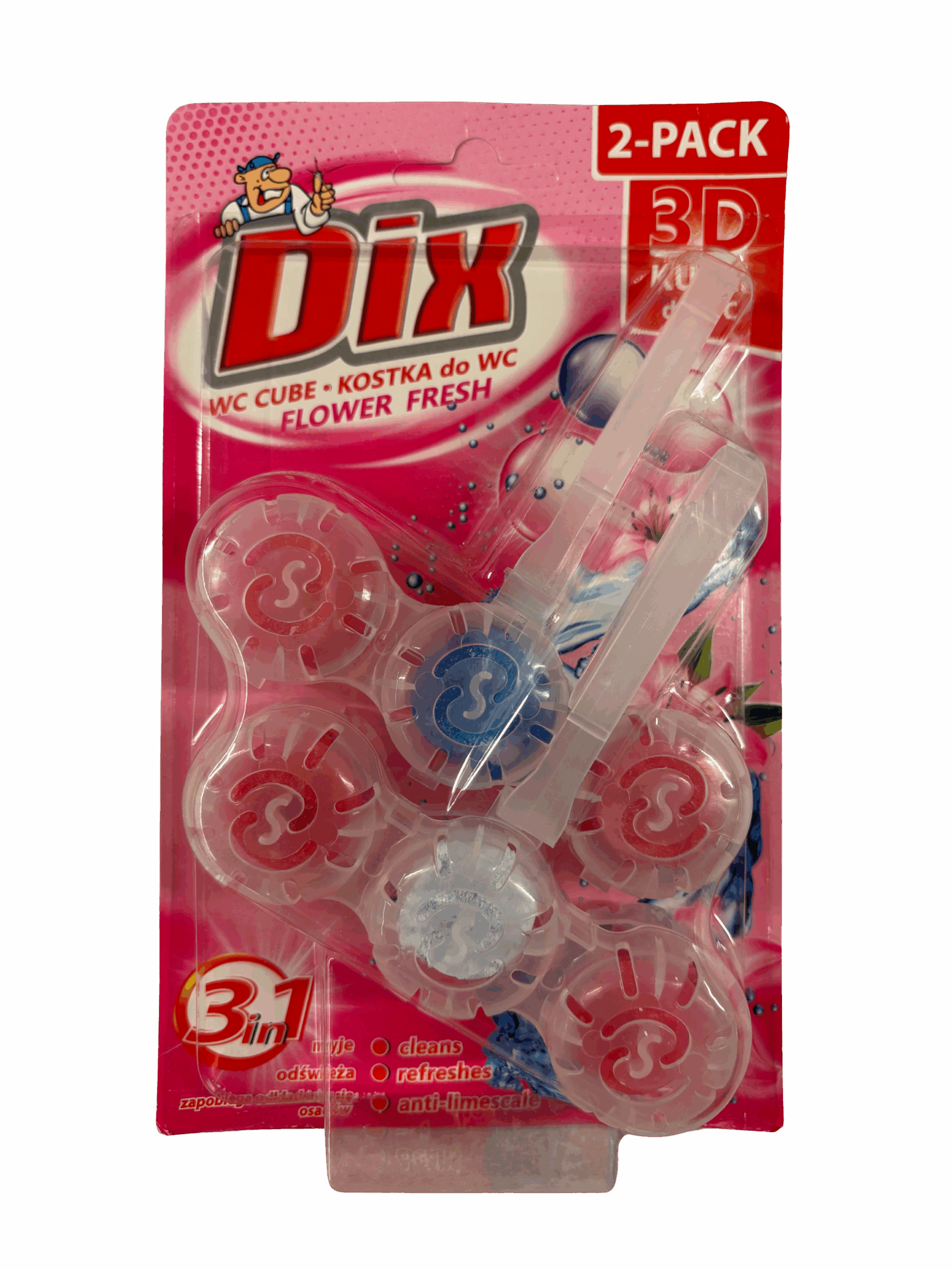 DIX Kulki do WC 3D DUO Flower Fresh 2×40 g to innowacyjny odświeżacz do toalety, który zapewnia czystość, świeży zapach kwiatów i ochronę przed osadem kamienia. Kulki w praktycznej zawieszce DUO skutecznie czyszczą muszlę, uwalniają pianę podczas spłukiwania i długo utrzymują przyjemny, kwiatowy aromat.