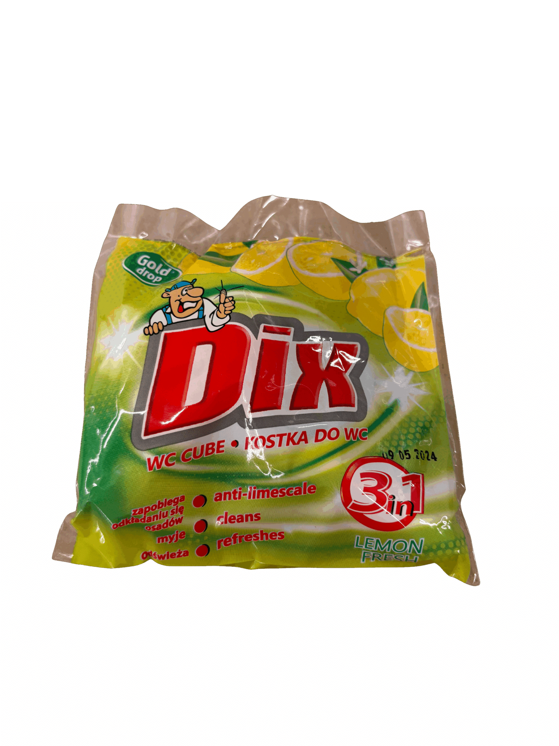 DIX Kostka do WC 3w1 Lemon Fresh 35 g to kompaktowe i skuteczne rozwiązanie dla czystości toalety. Dzięki zawieszce z koszyczkiem kostka zapewnia potrójne działanie: usuwa osady, odświeża wodę i zapobiega powstawaniu kamienia. Zapach Lemon Fresh roztacza przyjemną cytrynową świeżość po każdym spłukaniu, a pianująca formuła sprawia, że muszla wygląda na czystą i zadbaną. Idealna do regularnego stosowania w domach, biurach i miejscach publicznych, gdzie zależy Ci na świeżości i higienie.