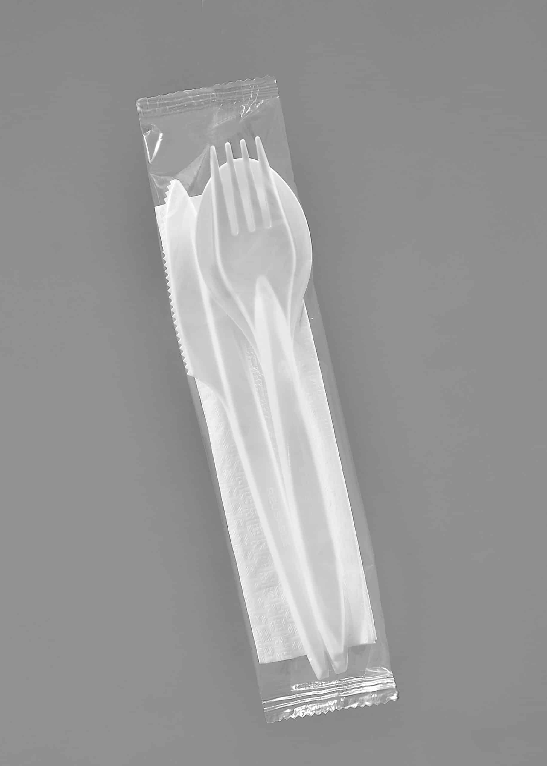 Zestaw widelec + nóż + łyżka + serwetka białe, grube, 300 sztuk, pakowane osobno, to praktyczne i higieniczne rozwiązanie do gastronomii, cateringu i przyjęć. Grubszy plastik zapewnia większą wytrzymałość sztućców podczas serwowania i jedzenia, a papierowa serwetka 2-warstwowa gwarantuje estetykę i higienę.