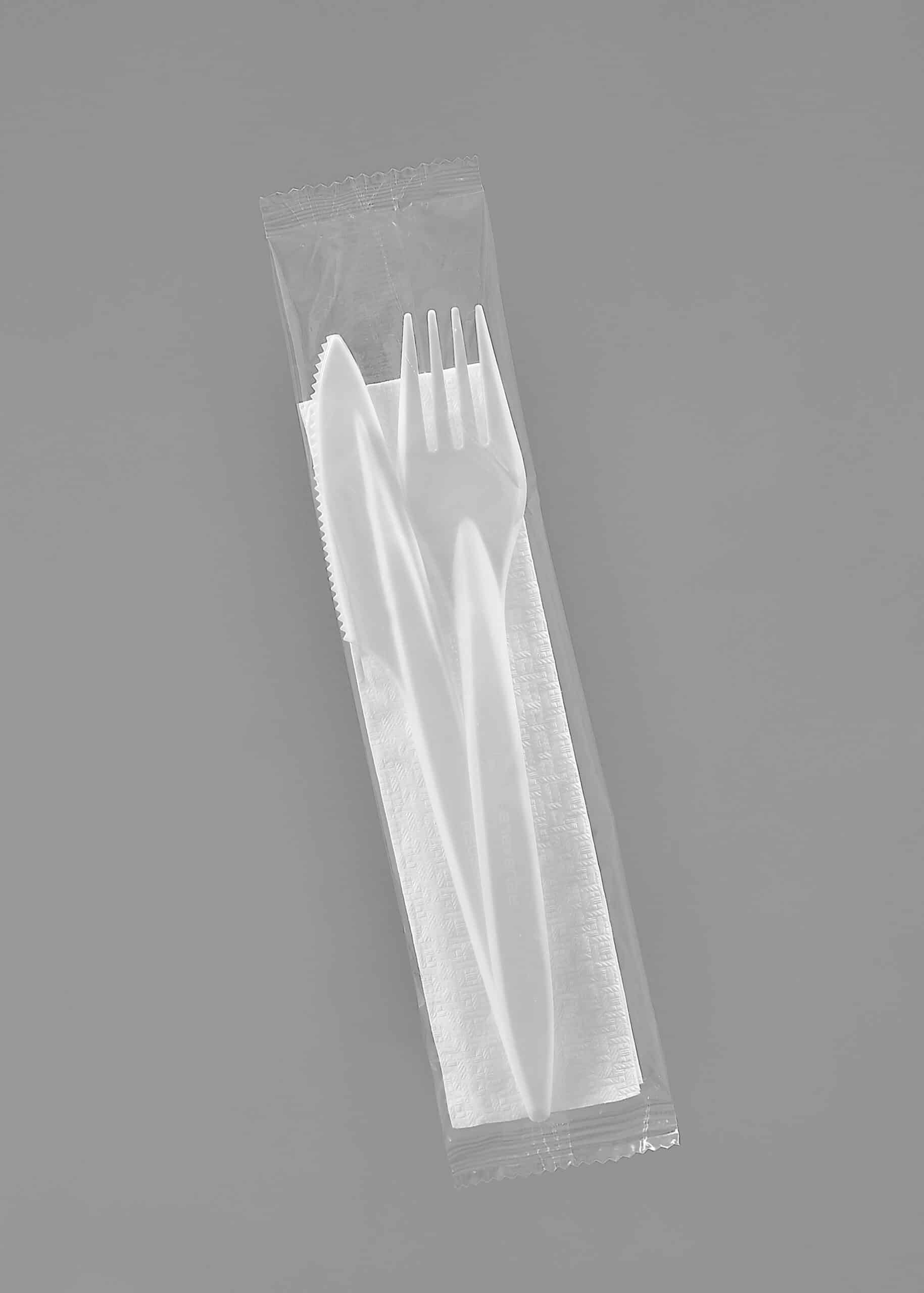 Zestaw widelec + nóż + łyżka + serwetka białe, grube, 300 sztuk, pakowane osobno, to praktyczne i higieniczne rozwiązanie do gastronomii, cateringu i przyjęć. Grubszy plastik zapewnia większą wytrzymałość sztućców podczas serwowania i jedzenia. Papierowa serwetka 2-warstwowa gwarantuje estetykę i higienę.