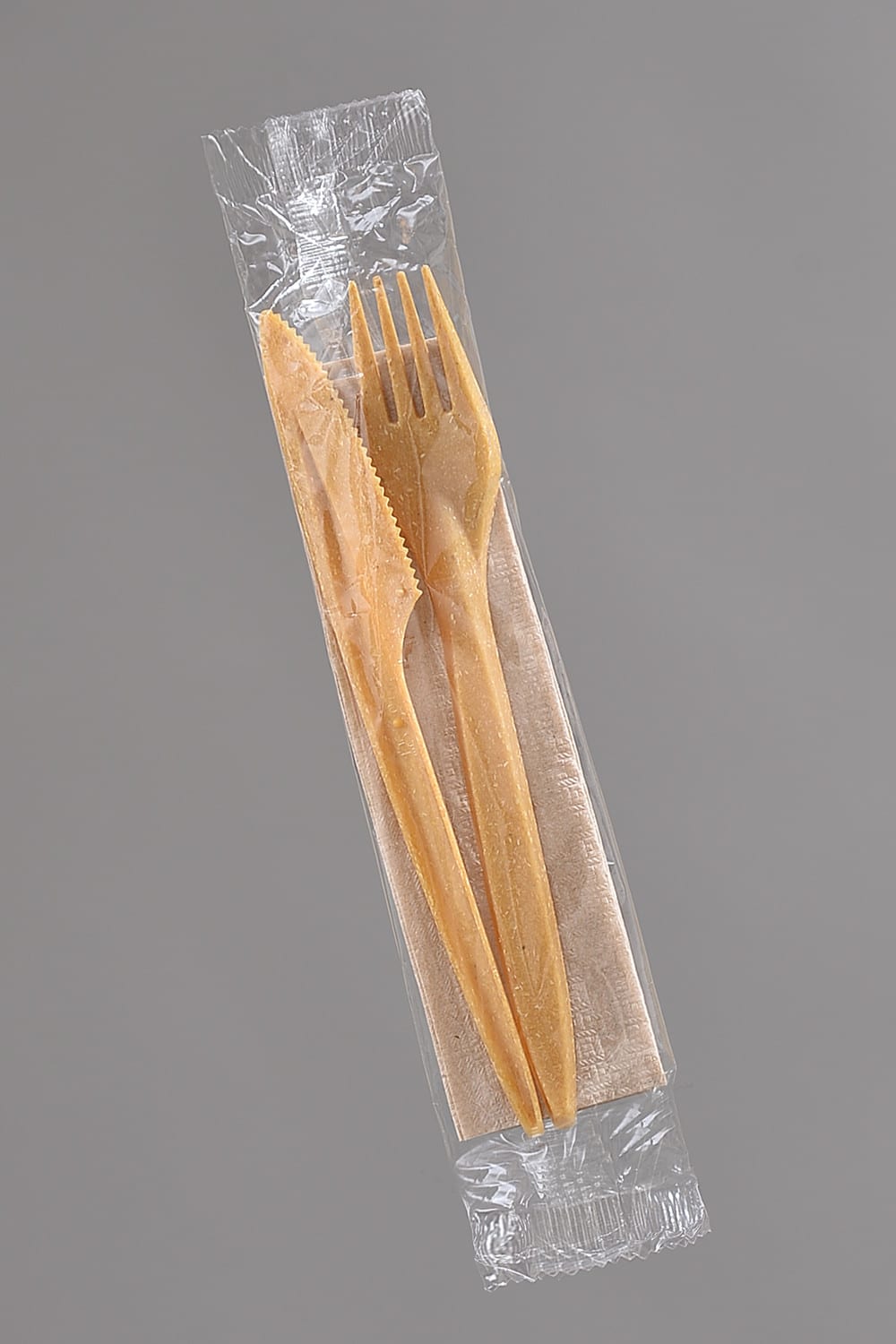 Ekologiczny zestaw jednorazowy składający się z noża, widelca i serwetki, zapakowany w higieniczną folię. Wykonany z wytrzymałego materiału WPC (Wood Plastic Composite) – kompozytu drewna i tworzywa sztucznego – stanowi nowoczesną i bardziej ekologiczną alternatywę dla tradycyjnych sztućców plastikowych.