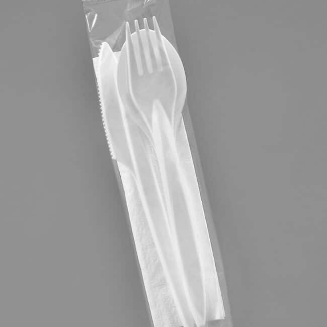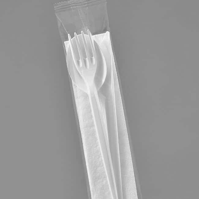 Zestaw sztućców widelec + nóż + łyżka + serwetka białe pakowane osobno – 350szt.