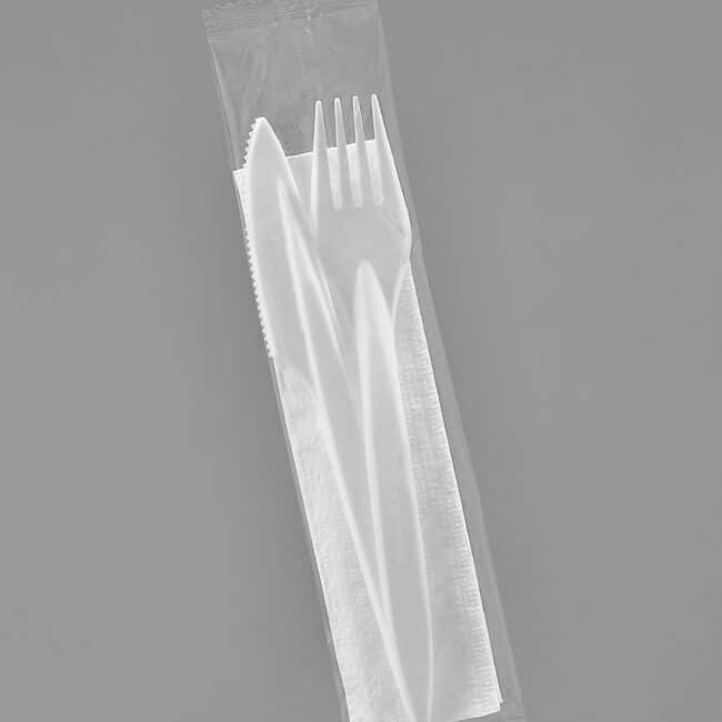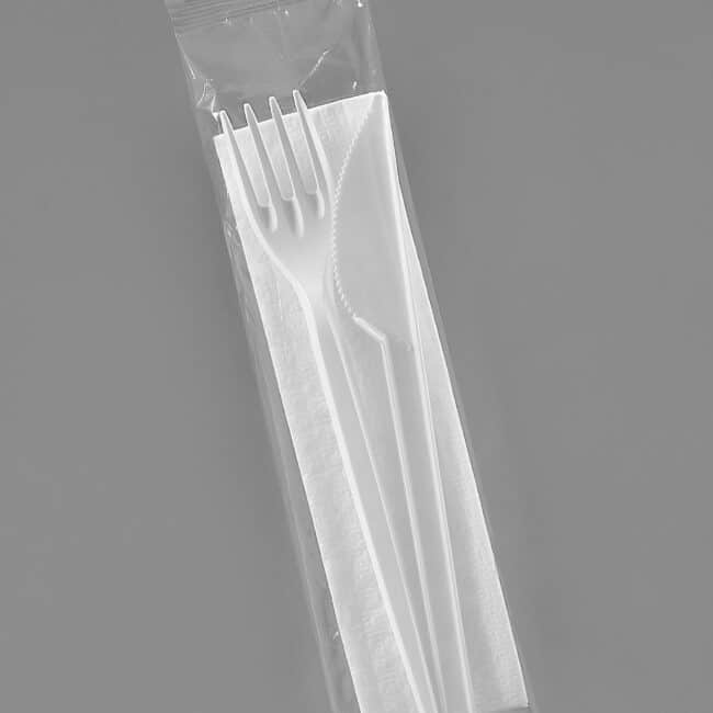 Zestaw sztućców widelec + nóż + serwetka białe pakowane osobno – 350szt.